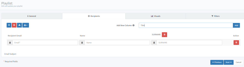 Burada mail kolonu hariç diğer kolonlar özelleştirilebilir. Add new column ile yeni kolon ekleyebilirsiniz. Surname kolonu bana ait. Sol tab menüdeki “+” ile yeni alıcı ekleyebilirsiniz.