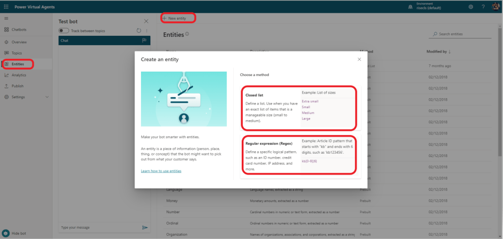 Doğal dilde desteğinde en önemli rolu Entity‘ler oluşturuyor. PVA içerisinde gömülü gelen entity’lere (Prebuild Entities) ilave olarak kendiniz de “Custom Entity” ile özel entity’ler oluşturabilirsiniz.