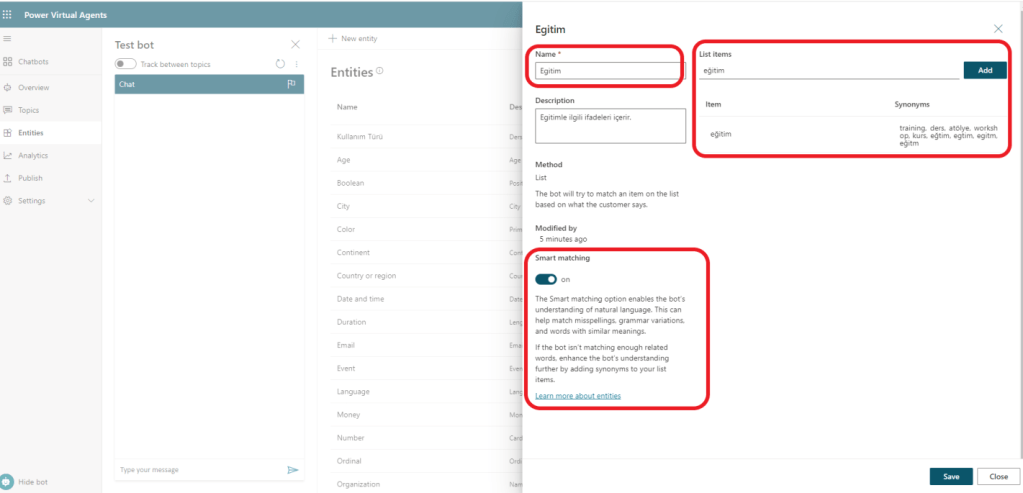 Burda dikkat etmem gereken “Smart Matching”in açık olması. Smart matching’de doğal dilde anlama modelinin bir parçası aslında. Smart matching etkinken kullanıcının girdiği inputlar, fuzzy match ile doğru şekilde anlaşılmaya çalışılacak. Bu son kullanıcının kelime hatalarını, dil bilgisi hatalarını tanımlamasına ve doğru kelimeyi tayin etmesini sağlayacak. Ne kadar çok yanlış yazım girerseniz (benim yukarıda gösterdiğim gibi egitim yerine egtim’i belirtmem gibi) botunuz o kadar hatayı doğru anlayabilir. Kaydettikten sonra entity’yi bot içinde kullanabilirsiniz.
