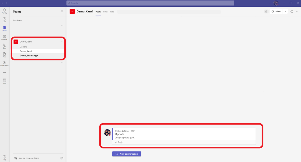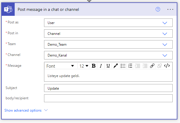 İlgili listeyi ve mesajın Microsoft Teams’de kimin adına gönderileceğini seçtikten sonra kanal ve ekip seçimlerinide tamamlıyorum.