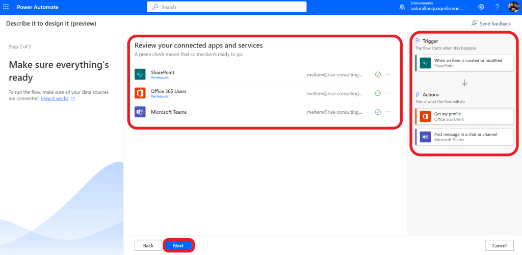 Doğal dilde akış oluşturmak için istediğiniz akışı metin olarak yazmanız yeterli, Power Automate OpenAI Codex‘in yardımıyla metninizi koda çeviriyor ve sizin için akışı aksiyon ve trigger’larıyla beraber preview halinde düzenlenebilir bir şekilde sunuyor.
