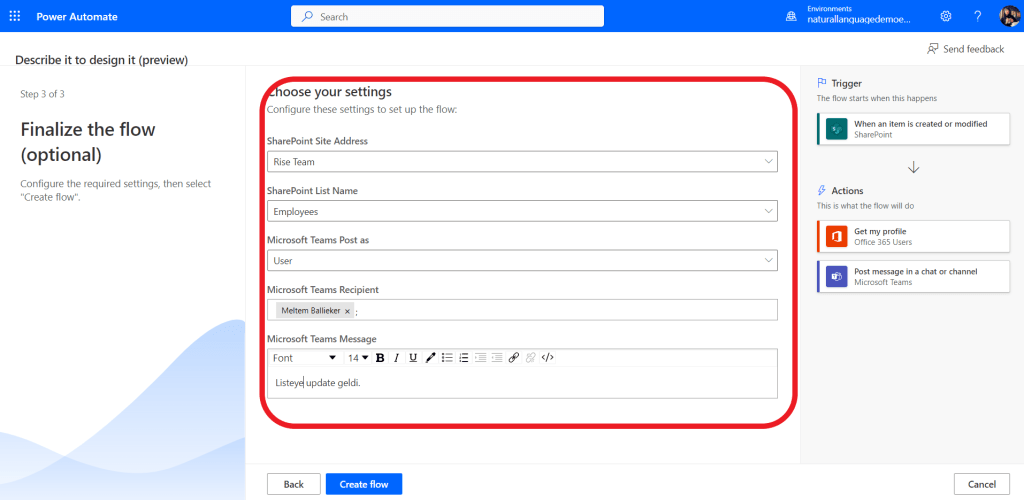 Yukarıdaki bar’a oluşturmak istediğiniz akışı İngilizce yazabilirsiniz. Diğer dillerde (Almanca, İspanyolca gibi) çalışabildiğini ancak destek verilmediğinin altını çizelim. Benim akışım belirttiğim sharepoint listesindeki değişiklikleri Microsoft Teams’de belirttiğim ekip ve kanalda mesaj olarak almak şeklinde olacak.