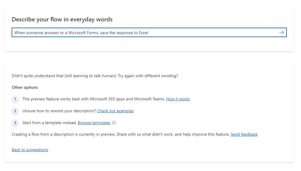 Doğal dil desteği sadece bulut tabanlı akışlarda var ve henüz parametre algısı yok.