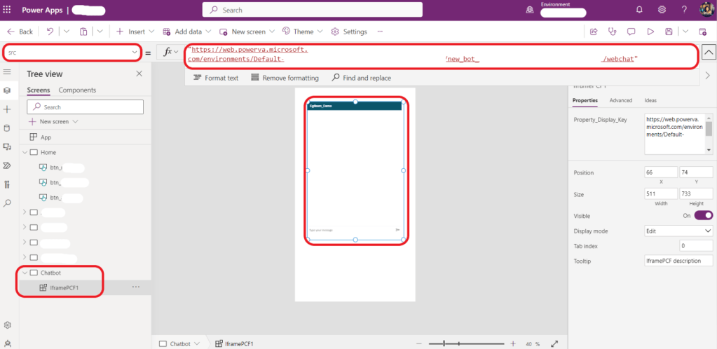 Canvas uygulamama bir sayfa açıyorum “Chatbot” adında ve iframe komponentini ekliyorum. Komponentin kaynak kısmına embed kodda yer alan src linkini kopyalıyorum ve chatbotun uygulamaya gömüldü.