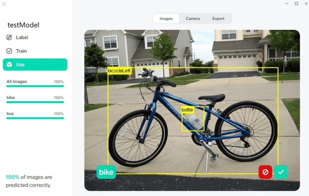 Test imajımı sürükle bırakla bırakıyorum ve model bana resimde bisiklet olduğu sonucunu veriyor. Eğer yanlış tahmin yapsaydı kızmızı butonla düzeltme yapabilirdim. Daha fazla test ve resim yükledikçe model öğrenmeye devam edecektir.