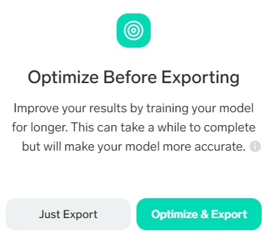 Export dediğimde modelin optimizasyonu için bir kere daha train edilip daha performanslı çalışmasını isteyip istemediğimizi soruyor. Optimize edip export edebilirim.