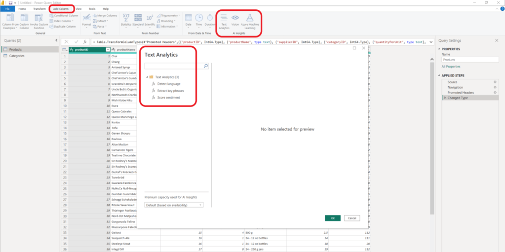 Önce Power BI Desktop’a gidip içeriye ilgili datasetimi aldıktan sonra Power Query Editor ekranına gidiyorum. Tab ribbon’da yer alan Add Column altındaki AI Insights’dan Text Analtyics’i seçtim.