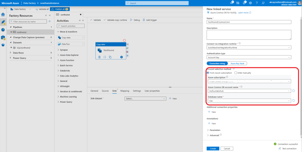 Source dataseti tamamladığıma göre, şimdi benzer şeyleri Cosmos DB yani hedef kaynak (Sink) için yapacağım