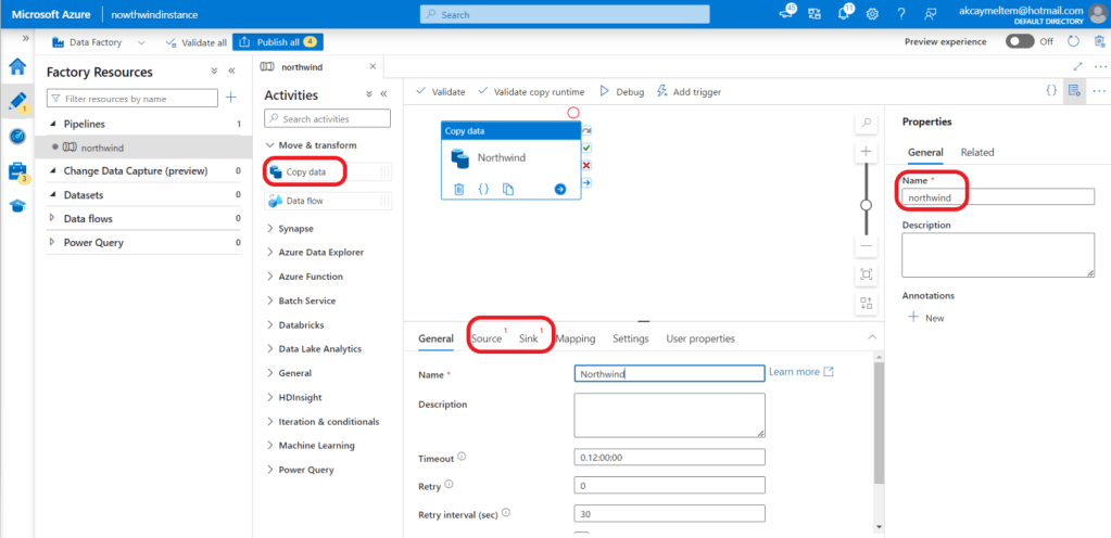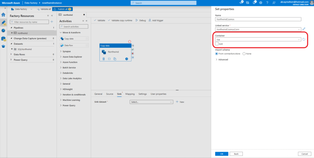 Ardından Azure Data Factory’yegeçip veriyi migrate edecek pipeline dizaynını adım adım yapıyorum.
