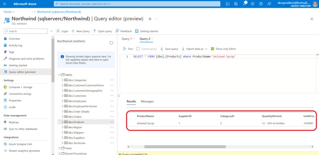 Önce Azure SQL DB’ye daha önce import ettiğim Nortwind tablolarıma ve aktarımını yapacağım Product tablosundan örnek bir kayda (Aniseed Syrup) bakalım;