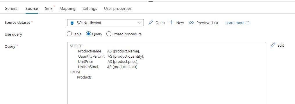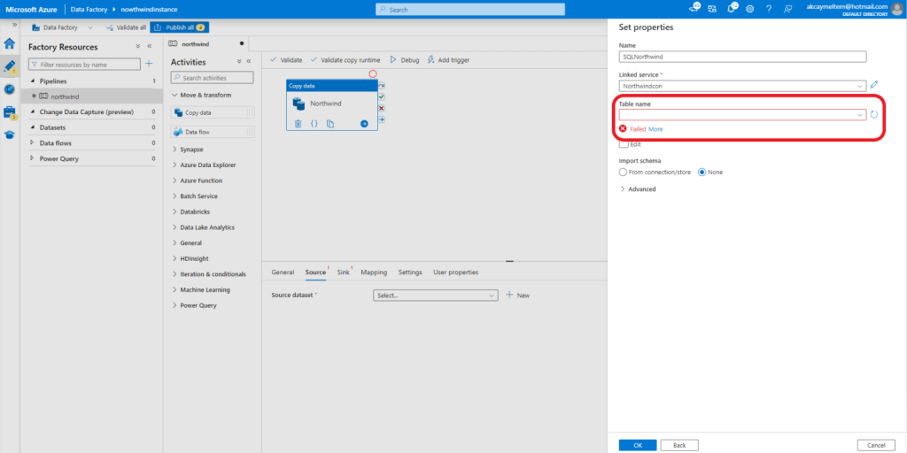 Azure SQL DB ile yeni bir linked service oluşturduktan sonra connection setup’ıma bakıyorum. Table name kısmı fail olarak geldi, migration’da query olutşuracağım için şuan sorun değil, doğrudan OK diyorum.