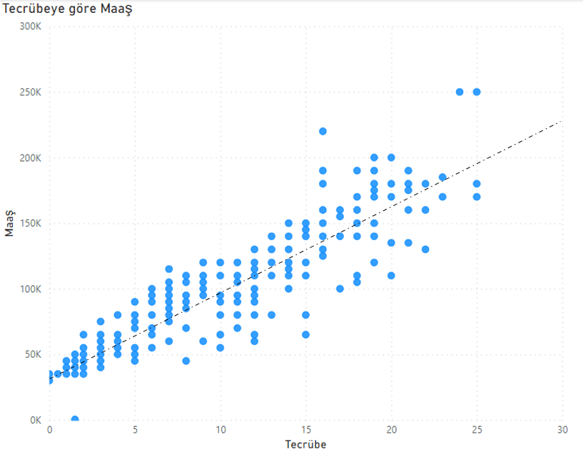 Bir örnek üzerinden gidelim ve tecrübe ile maaş grafiğinin dağılımına bakalım. x=0 durumuna karşılık gelen y değeri ve y=0’a karşılık gelen x değerleri üzerinden bu dağılımı en iyi ifade eden lineer regresyon fonksiyonunu tanımladığımızda bu doğrunun eğimi bize istediğimiz x değerine (yıl) karşılık gelen tahmini maaş (y) değerini verecektir. m ve c ne kadar iyi bilinirse verisetiyle o kadar uyumlu doğru denklemi elde edilmiş olur ve o kadar doğru tahmin elde edilir.