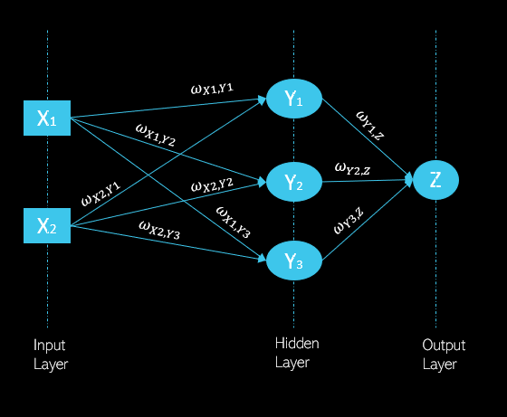 Herbir ağ üç kısımdan oluşur: input (girdi) katmanı, hidden (saklı) katman ve output (çıktı) katmanı. Herbir katman bir sonraki katmanı beslediği için bu bir feed forward (ileri beslemeli) bir ağdır. Yani X1’in activation fonksiyon uygulanmış çıktısı Y1 nöronunun girdisidir. Wx1,Y1 tam olarak X1 nöronundan gelen çıktının Y1 nöronuna girdi olarak geçtiğini ifade eder. Y1 nöronunun çıktısı da Z nöronunun girdisidir.